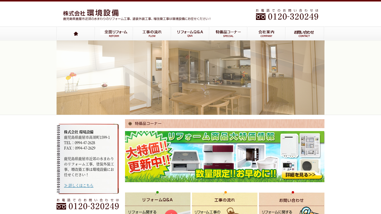 鹿児島県鹿屋市にある「株式会社 環境設備」は、水回りのリフォーム工事、塗装外装工事、増改築工事など幅広いサービスを提供している会社です。給湯器の修理や交換はもちろん、水回り設備機器や住宅建材まで、豊富な品揃えと経験豊富なスタッフがお客様のニーズに合わせた最適な提案をいたします。地域密着型のサービスで、迅速かつ丁寧な対応が魅力です。