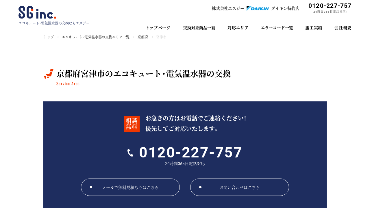 京都府宮津市にある株式会社エスジーは、エコキュート・電気温水器の交換・修理を専門とする業者です。 24時間365日対応で、お客様の急なトラブルにも迅速に対応してもらえます。 各機種専任の技術者が、丁寧な施工と安心のサービスを提供。 大手メーカーとの直接契約により、業界最安値価格を実現しています。 給湯器に関するお困りごとがあれば、ぜひ相談してみましょう。