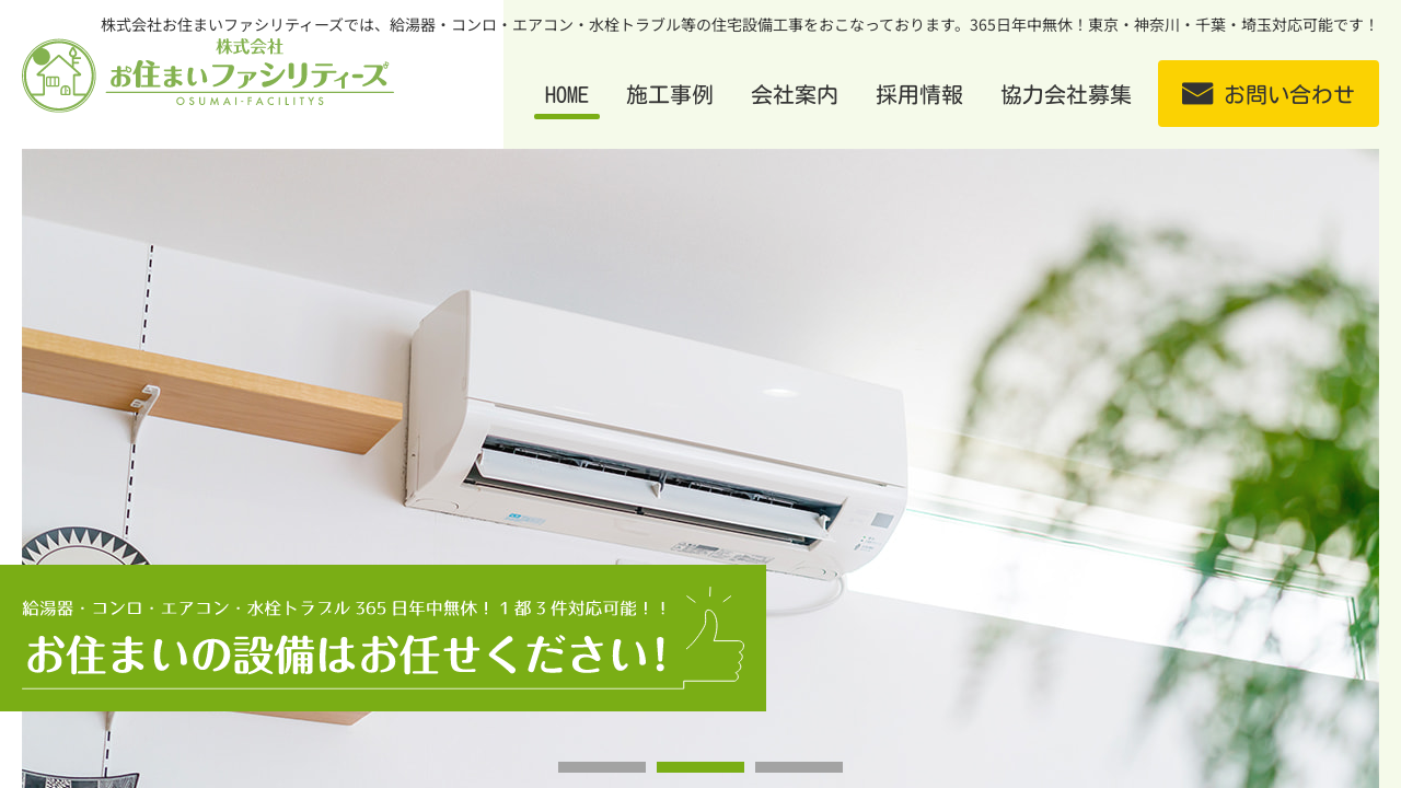 株式会社お住まいファシリティーズは、給湯器をはじめ、コンロ、エアコン、水栓などの住宅設備工事を専門とする会社です。 東京・神奈川・千葉・埼玉エリアに対応し、365日年中無休で、お客様の困りごとを迅速に解決してもらえます。 豊富な知識と経験を持つスタッフが、お客様に最適なプランを提案してもらえます。 給湯器に関するお困りごと、ぜひ相談してみましょう。