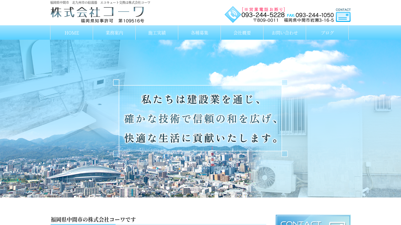 福岡県中間市を拠点に、北九州市をはじめとする周辺エリアで給湯器・エコキュートの取付・交換を請け負う株式会社コーワ。20年以上の豊富な経験を持つ代表が、お客様に最適な施工プランをご提案します。設置場所や家族構成に合わせた適切な製品選びから、丁寧な施工、そしてアフターサービスまで、安心と信頼をお届けします。給湯器に関するお困りごと、お気軽に相談してみましょう。