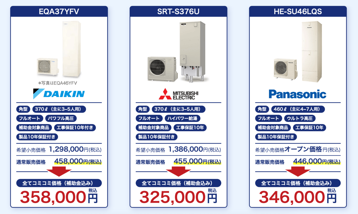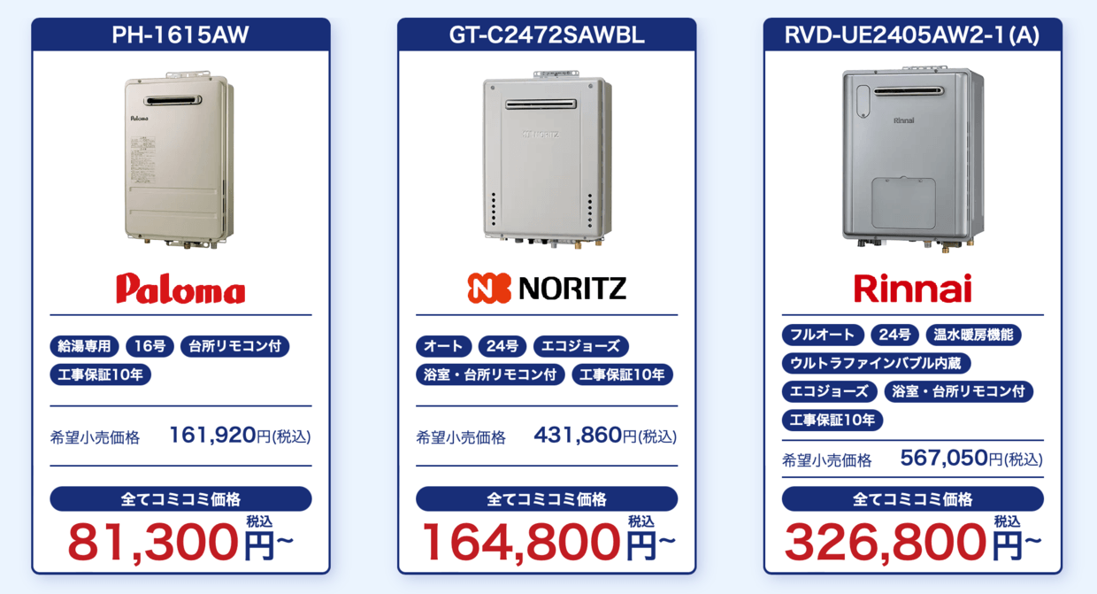 | 取り扱いメーカー | ガス給湯器(ノーリツ・リンナイ・パロマ等) エコキュート(三菱電機・ダイキン・コロナ等) |