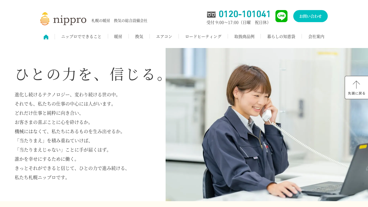 札幌ニップロ株式会社は、札幌市を中心に、暖房・換気設備の総合的なサービスを提供する会社です。 給湯器の設置・交換・修理はもちろん、ボイラー、エアコン、ロードヒーティングなど、住まいの快適な環境づくりをサポートしています。 長年の経験と実績に基づいた確かな技術力と丁寧な対応で、お客様の安心と満足を追求しています。