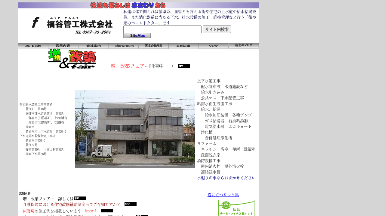 愛知県海部郡蟹江町にある「福谷管工」は、街や住宅の循環系、血管とも言える水道や給水給湯設備の施工・維持管理を行う「街や家のホームドクター」です。給湯器の修理・交換はもちろん、水回りリフォームなど、幅広いニーズに対応しています。地元密着型の営業で、迅速・丁寧な対応が魅力です。ガス給湯器、石油給湯器、電気温水器、エコキュートなど、様々な給湯器を取り扱っています。給湯器に関するお困り事は、ぜひ福谷管工に相談してみましょう。