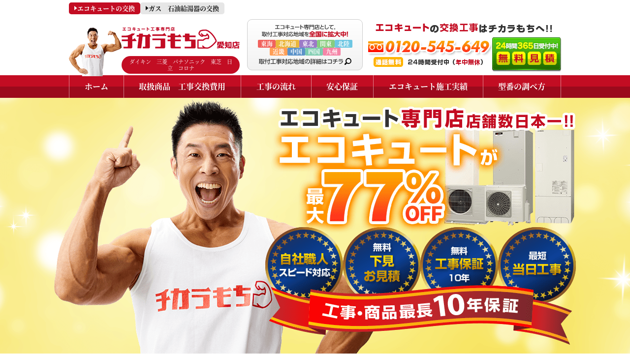 チカラもちは、関東・関西・中国・九州を中心に、全国でガス給湯器・エコキュートの修理、交換をおこなっている業者。