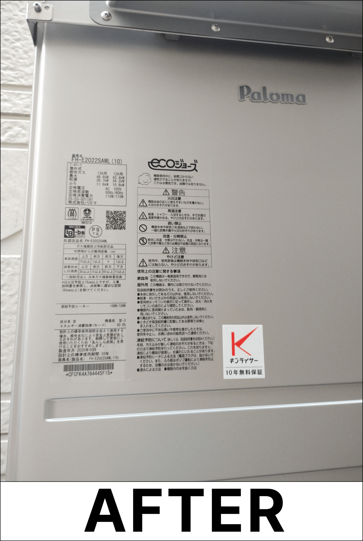 交換作業を終えた新しい給湯器は安定してお湯が供給され、以前のような不安定な症状は一切なくなりました。
