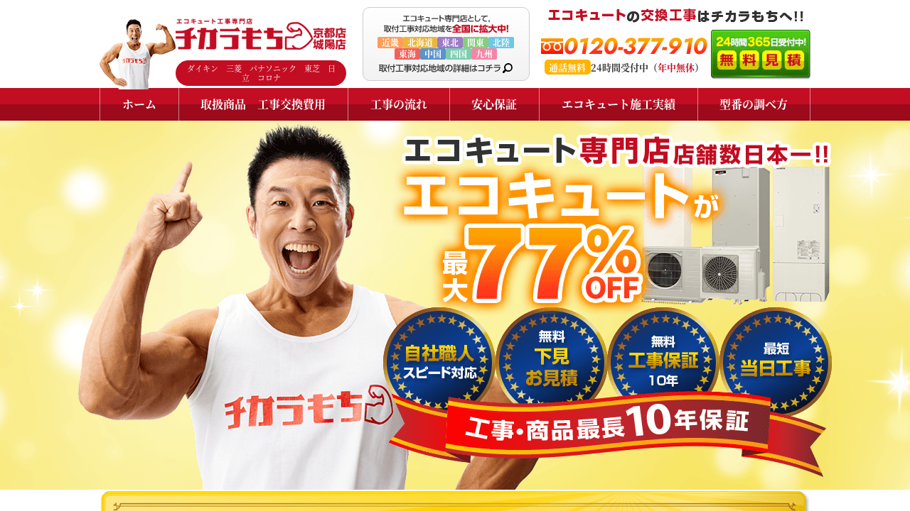 チカラもちは、関東・関西・中国・九州を中心に、全国でガス給湯器・エコキュートの修理、交換をおこなっている業者。