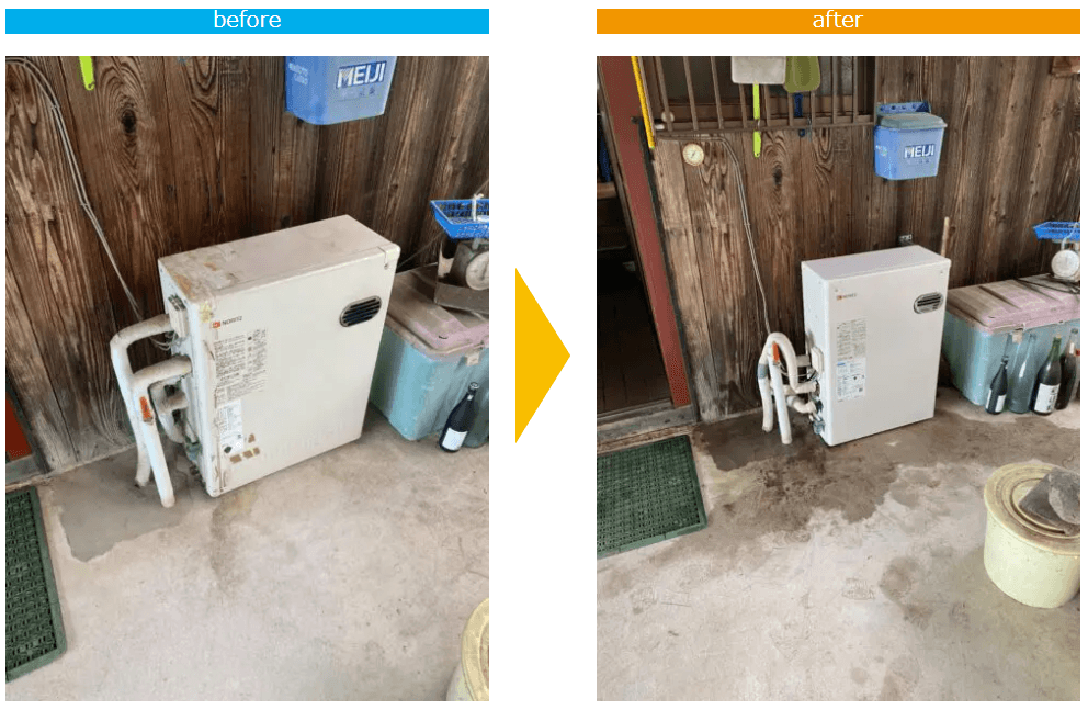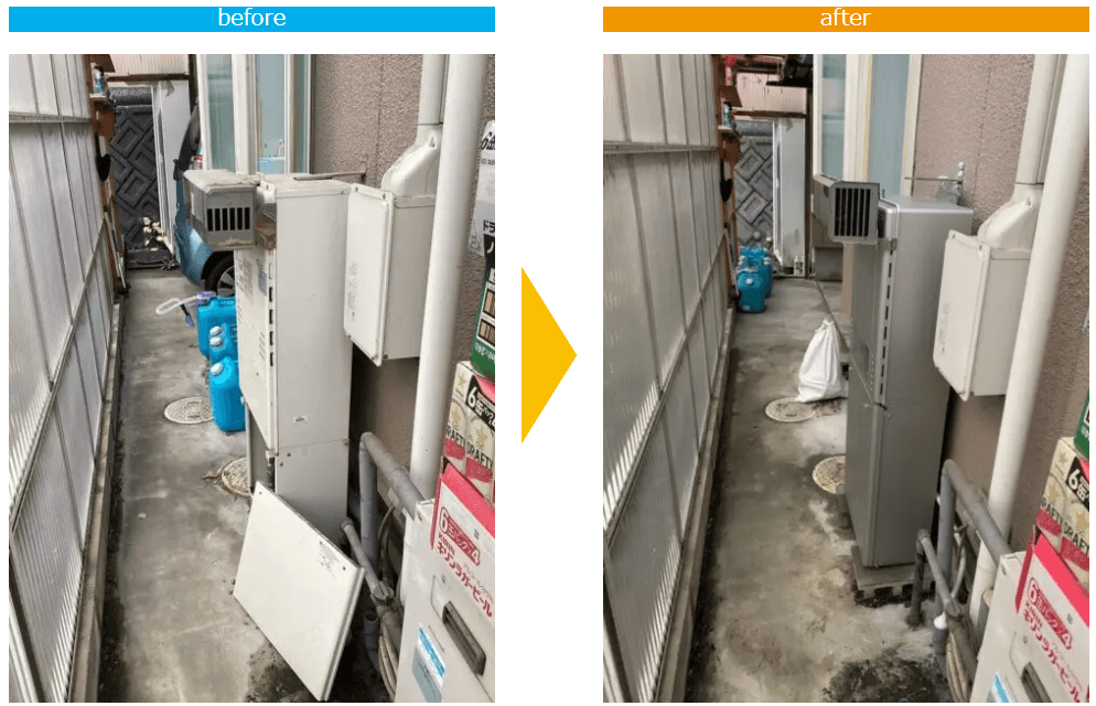 まず、古い給湯器の状態を確認し、取り外し作業に取り掛かりました。