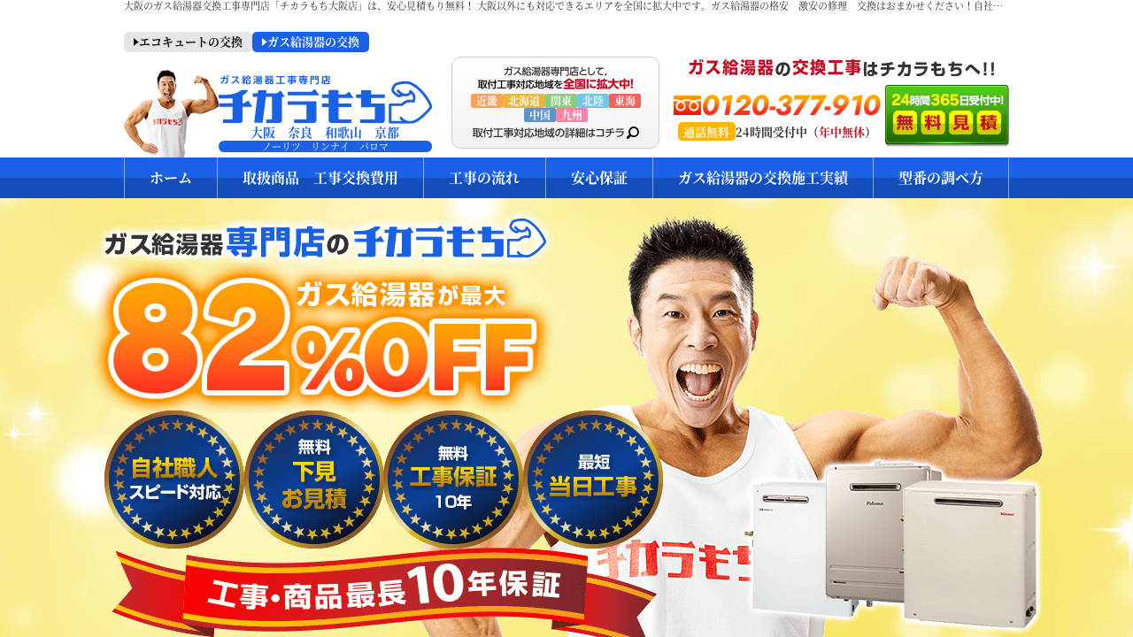 チカラもちは、関東・関西・中国・九州を中心に、全国でガス給湯器・エコキュートの修理、交換をおこなっている業者。