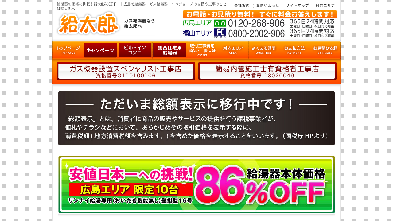 | 対応エリア(ガス給湯器) | 【関東】東京都 ・ 埼玉県 ・ 千葉県 ・ 神奈川県 【東海】三重県 【関西】大阪府・京都府・滋賀県・奈良県・兵庫県・和歌山県 【中国】広島県 |